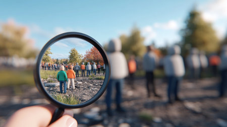 A close-up view through a magnifying glass reveals a diverse group of individuals gathered outdoors, emphasizing detail and human connection.