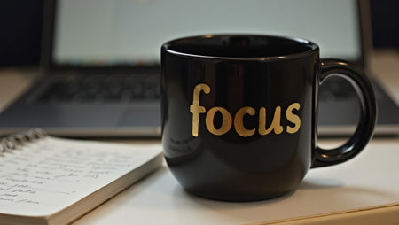 Black Focus mug beside laptop and notebook with handwritten notes