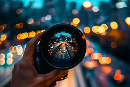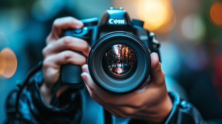 Close-up of a photographer holding a DSLR camera, with sharp focus on the lens, capturing urban reflections, symbolizing creativity and technology.