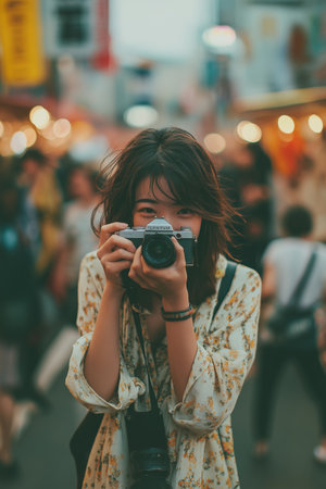 Beautiful asian thai woman traveler taking photo with vintage camera outdoors.