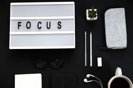 Black office table desk. Workspace with diary, plant, headphones, coffee, pencils, table with the word focus. Flat lay, top view