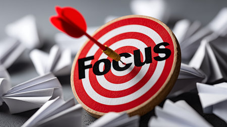 Focus concept with white text and magnifying glass in place of letter O over a target or bulls eye in a conceptual image on a panorama wood background - 3d illustration