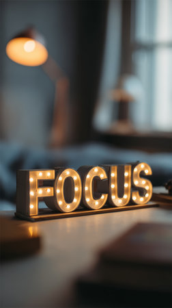 Focus word sign with light bulbs glowing warmly on table in cozy room with blurred background lamp and window