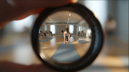 Yoga class in a bright studio seen through a lens, focusing on wellness and mindful exercise.