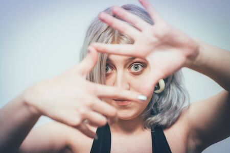 Close up hands make frame gesture. Melancholy misty valley bellow rocky peak. Cold spring daybreak in mountains.