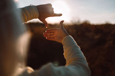New year planning and vision concept, Close up of woman hands making frame gesture with sunset, Female capturing the sunrise. copy space.