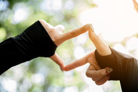 woman's hand creates a frame in front of the sun. idea of vision and focus