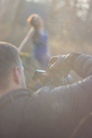 Photographer with professional equipment, capturing outdoor cycling race in thick fog. Struggle and resilience