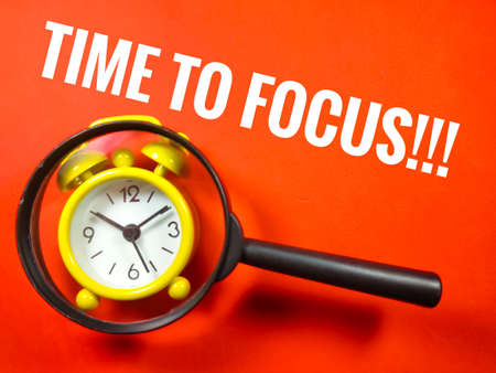 Text TIME TO FOCUS with magnifying glass and clock on red background.