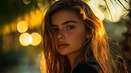 A captivating portrait of a young woman outdoors in warm sunlight. Her long hair catches the light, creating a serene atmosphere amidst lush greenery.