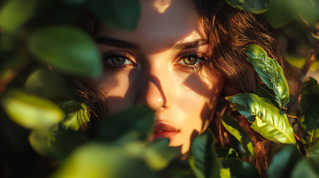 A close-up portrait of a woman surrounded by green leaves with sunlight casting shadows on her face, representing beauty, nature, and tranquility in a serene outdoor setting.