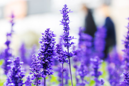 Summer violet garden flowers closeup, beautiful blossom floral card