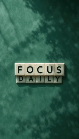 A visually appealing arrangement of text blocks spelling FOCUS DAILY against a serene green background, enhanced by soft shadows, ideal for motivational content.