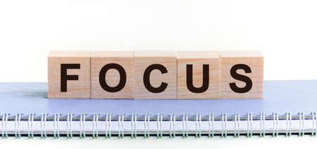 FOCUS - a word made of wooden blocks with black letters, a row of blocks is located on a blue Notepad. White background, front view. Target code, promo code concept.