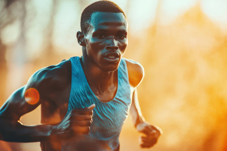 Black runners of various races entering the final stages The face shows concentration and effort, with sweat on the skin.
