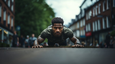 A young man, visibly sweating, expresses intense effort and focus during outdoor exercise