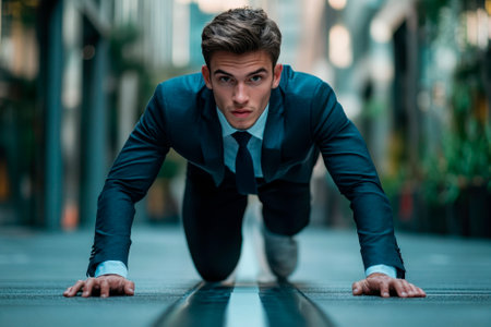 Businessman in start position ready to start race. Young Caucasian businessman in suit and tie doing push ups outdoors.