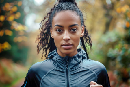 Beautiful young African-American woman in sportswear while jogging in nature.