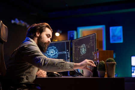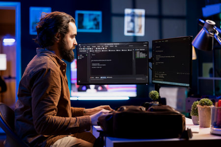 Developer in neon lit apartment implement security measures, protecting company systems and data. System administrator working from home, testing and debugging Javascript code