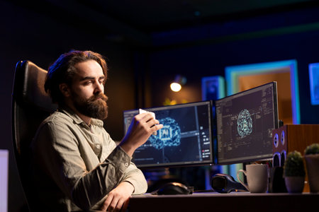 Software engineer writing code on multiple screens displaying artificial intelligence algorithm late at night. Programming online cloud computing on monitors to develop new html script.