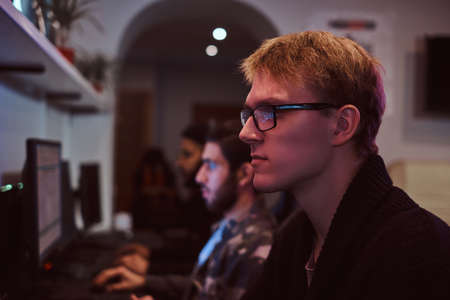Team of teenage gamers plays in a multiplayer video game on pc in a gaming club.