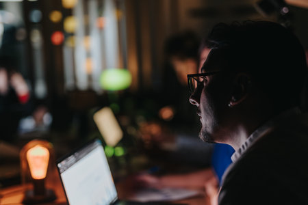 Diverse team of business people collaborates on a project at night, focusing on achieving critical deadlines.