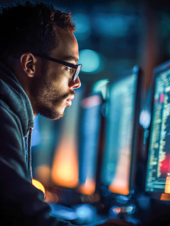 A young man concentrates intensely amidst a glow of several monitors, immersed in complex coding tasks during a late-night session in a quiet, dim environment.