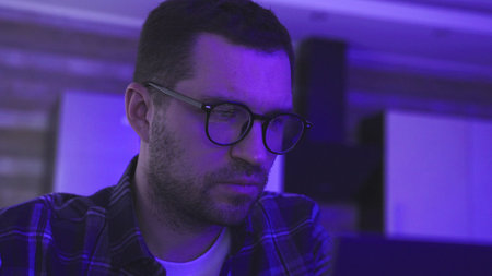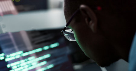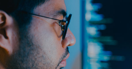 Developer in home office concentrating hard while doing coding on computer, extreme close up shot. Focus on IT admin paying close attention to screen while writing lines of code, camera A