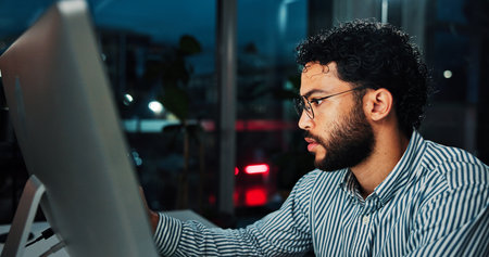 Computer, night and stock market with business man in office for finance, investment or trading. Financial, money and securities exchange with broker in workplace for evening portfolio management