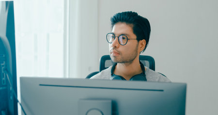 Young adult Asia male freelance eyeglasses typing write prompt AI bot IT app smart program nomad, video game, terminal with coding, user interface, designer, big data center on desktop computer.