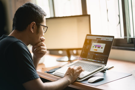software develper working on laptop at home office. Programmer working develop web application. Software programming concept