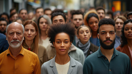 Diverse group of people in different ages and ethnicities stand together and looking forward. Diversity and multi ethnicity concept