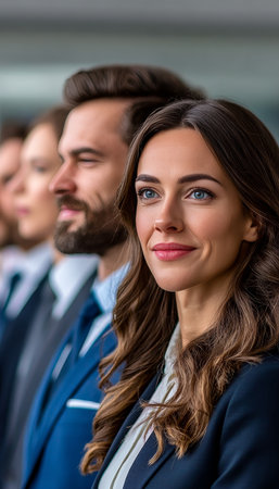 A diverse group of professionals stands confidently in an office environment, dressed in business attire. High quality photo