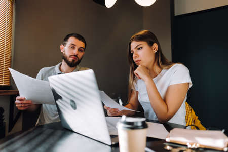 A young couple manages finances by looking through their bank accounts in the living room at desk using laptop. Woman and man look at documents together. Planning budget expenses. High quality photo