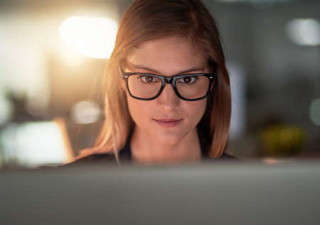 Lets see what we have here. Shot of a young businesswoman working on a computer in an office.