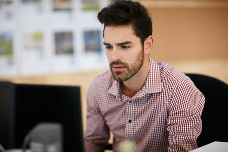 Young office worker stare at computer screen, search information online