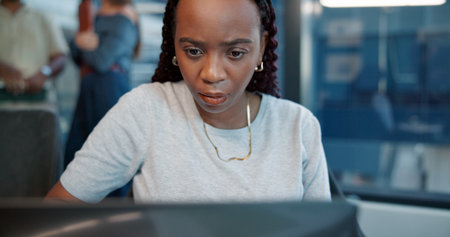 Creative, reading and business woman with computer in office for problem solving or copywriting. Technology, startup and serious worker with project for content writing, review article and coworking