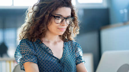 Hipster girl in glasses professional content writer typing promotional article on pc laptop computer while sitting at desktop in modern office interior. Female blogger keyboarding on netbook gadget