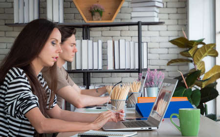 An Asian millennial man and woman collaborate on project campaign and marketing advertisement, working together in the office.