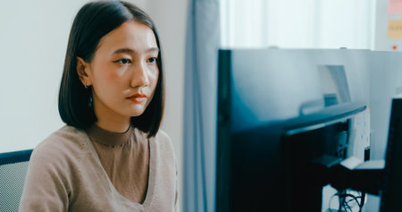 portrait hardworking asian female creative worker is typing project on the laptop with concentration at desk in the office.