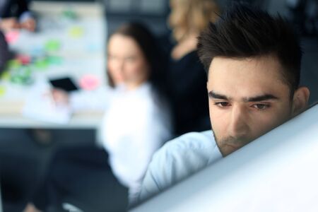 Casual man working on desktop computer in modern open plan startup office interior. Selective focus