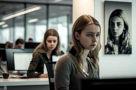 A close up portrait of a girl young pretty serious concentrated working freelancer