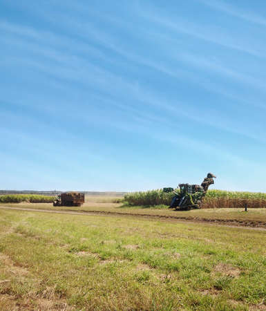 Australian rural agriculture sugarcane harvesting in spring with cloudy blue sky background