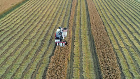 Aerial view of working tractor and corn harvester. Corn harvest