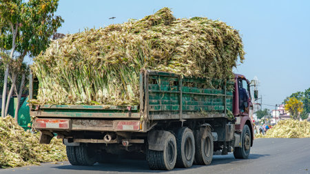 A truck heavily loaded with freshly cut agricultural crops drives along a sunny rural road, showcasing the vibrant atmosphere of farm life and transport logistics.