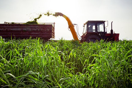 Silage process for stocking feed animals. Tractor with mounted agricultural machine, dragging forage harvester for silage, is depositing fresh harvested green crop in trailer behind.