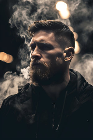 Beard man smoking Black and white portrait of handsome young bearded man smoking a cigarette and looking at camera while standing against brick wall : Generative AI