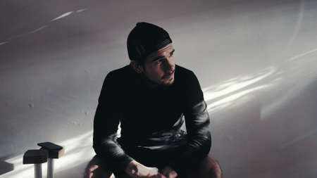 In a dark room, a man stands with eyes closed as a single beam of light shines on his face. This moment captures a profound sense of hope amidst the surrounding darkness, emphasizing resilience.