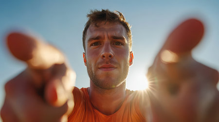 Young man pointing at the viewer with a confident expression during sunset with bright sunlight creating a warm and dynamic atmosphere