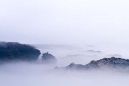 Landscape of mist covered dunes of the Puinhoop in the Coepelduynen at dawn in Katwijk, Netherlands. Nature image from Holland.